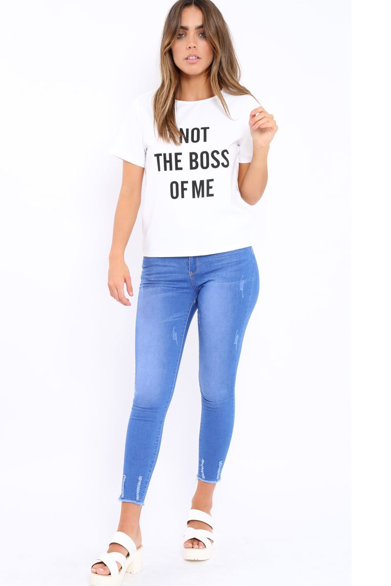 Make a statement in our Arshi Not the Boss of Me T Shirt featuring stand out slogan, loose comfortable fit and crew neck. Style easily with skinnies and flats and let the tee do the talking!