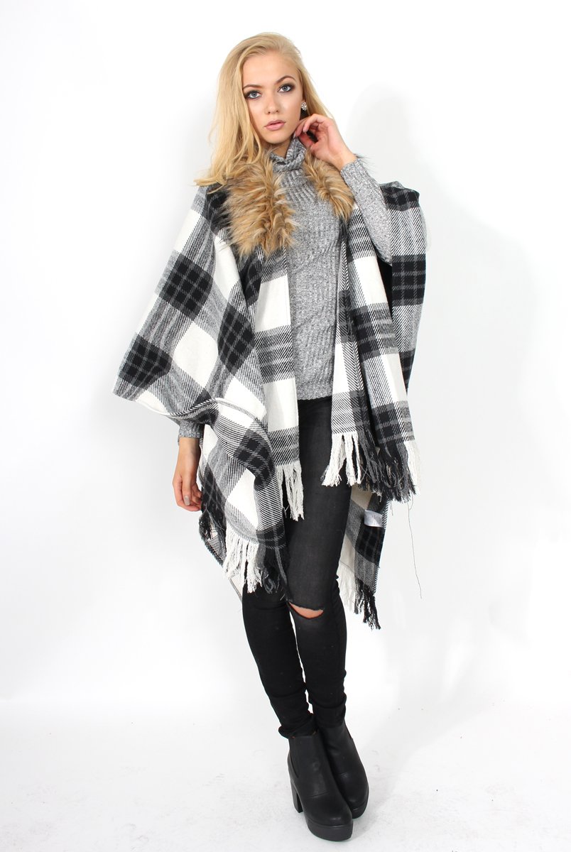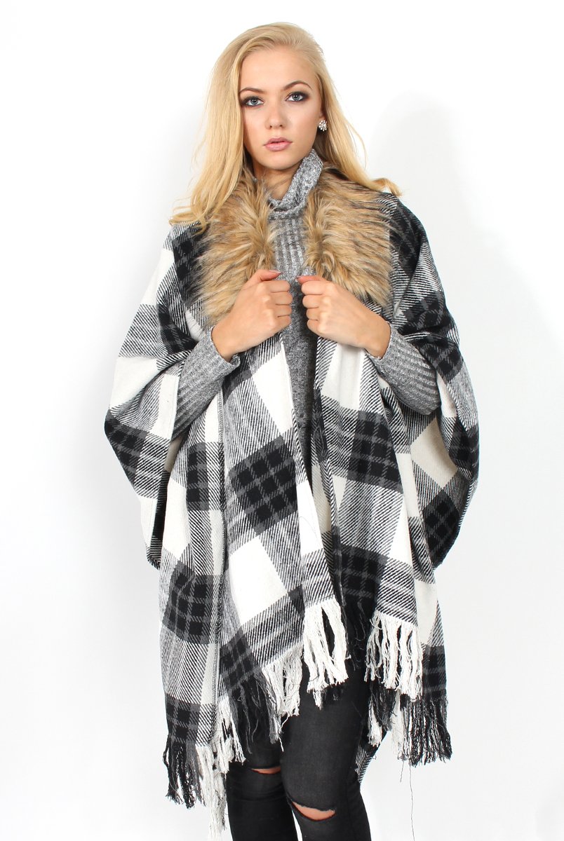 Style it up in this gorgeous Latoya Faux Fur Trimmed Cape. Get the ultimate chic look with a pair of high waisted skinnys and some over the knee boots.