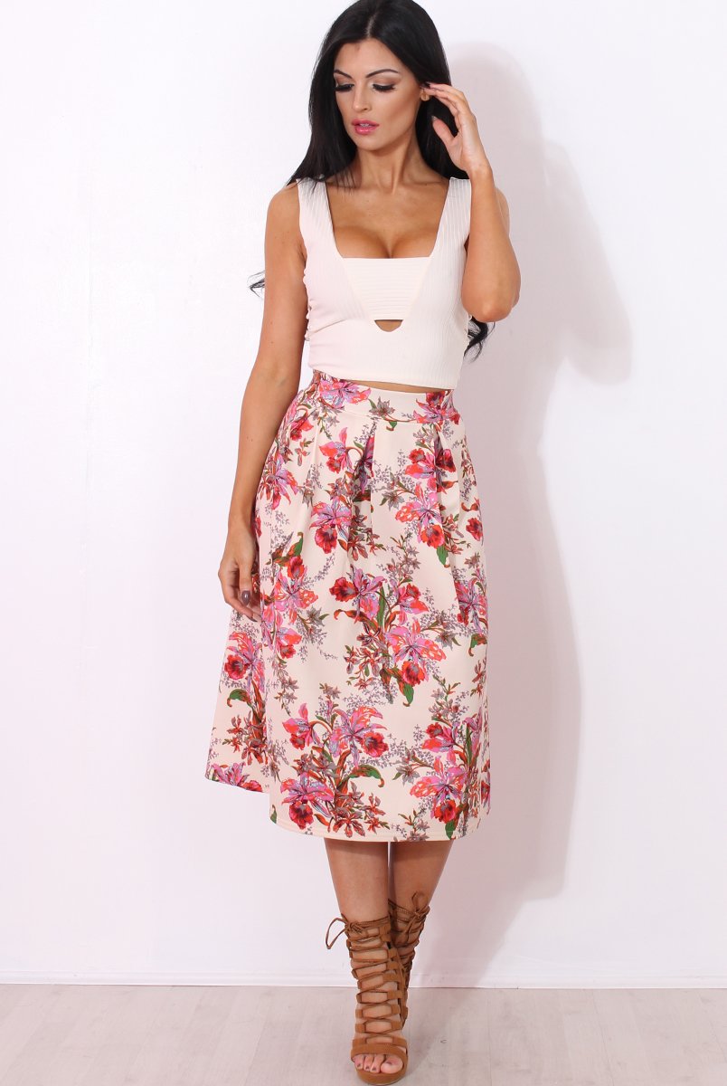 Fergi Nude Floral Print Midi Skirt