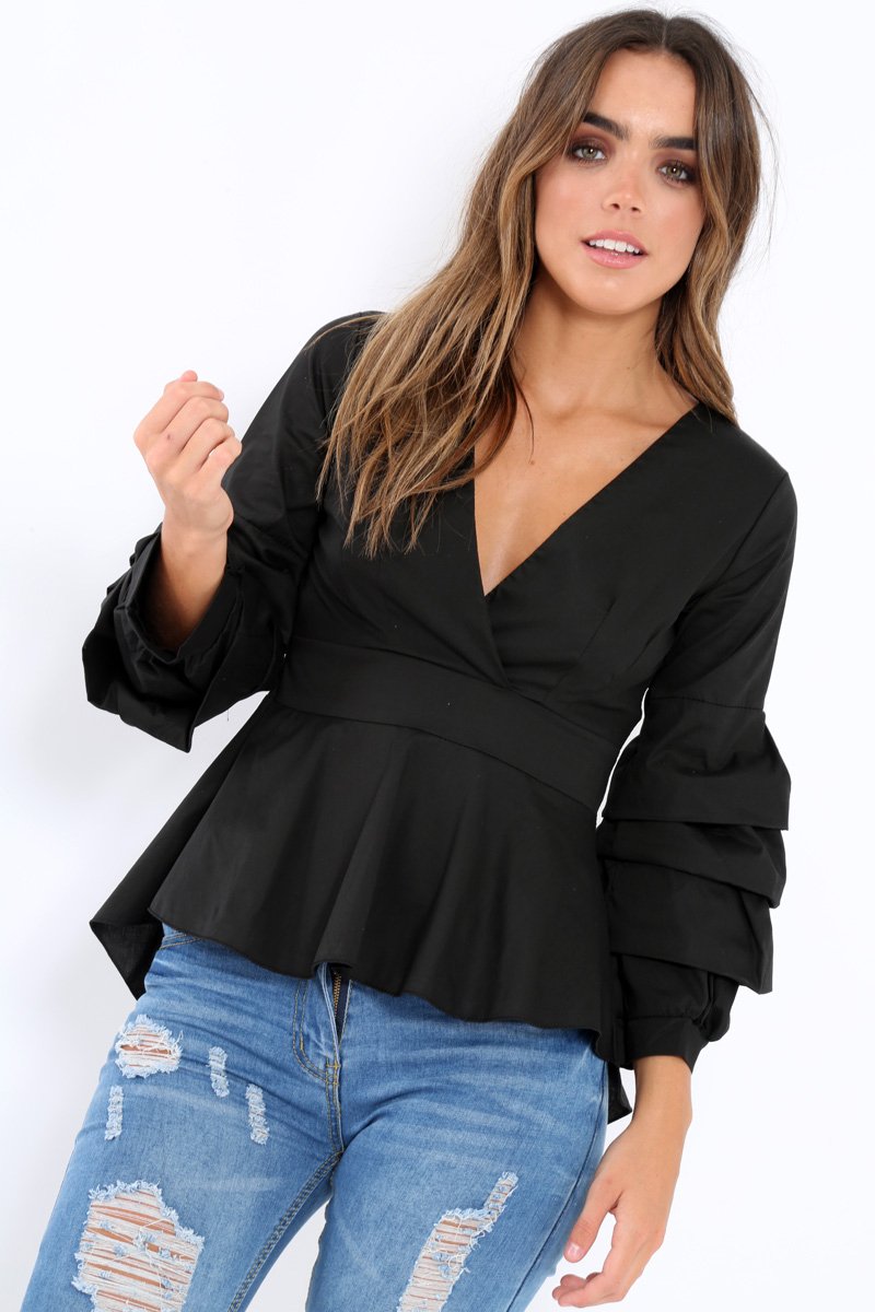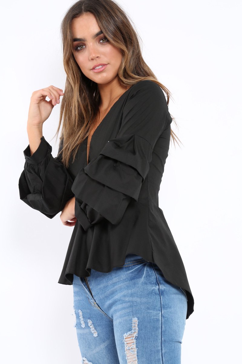 Look hot in this Avah Black Pleated Dip Hem Top. Featuring V neck plunge, pleated dip hem and ruffle sleeves. Style with skinny jeans and killer heels and you're date night ready!