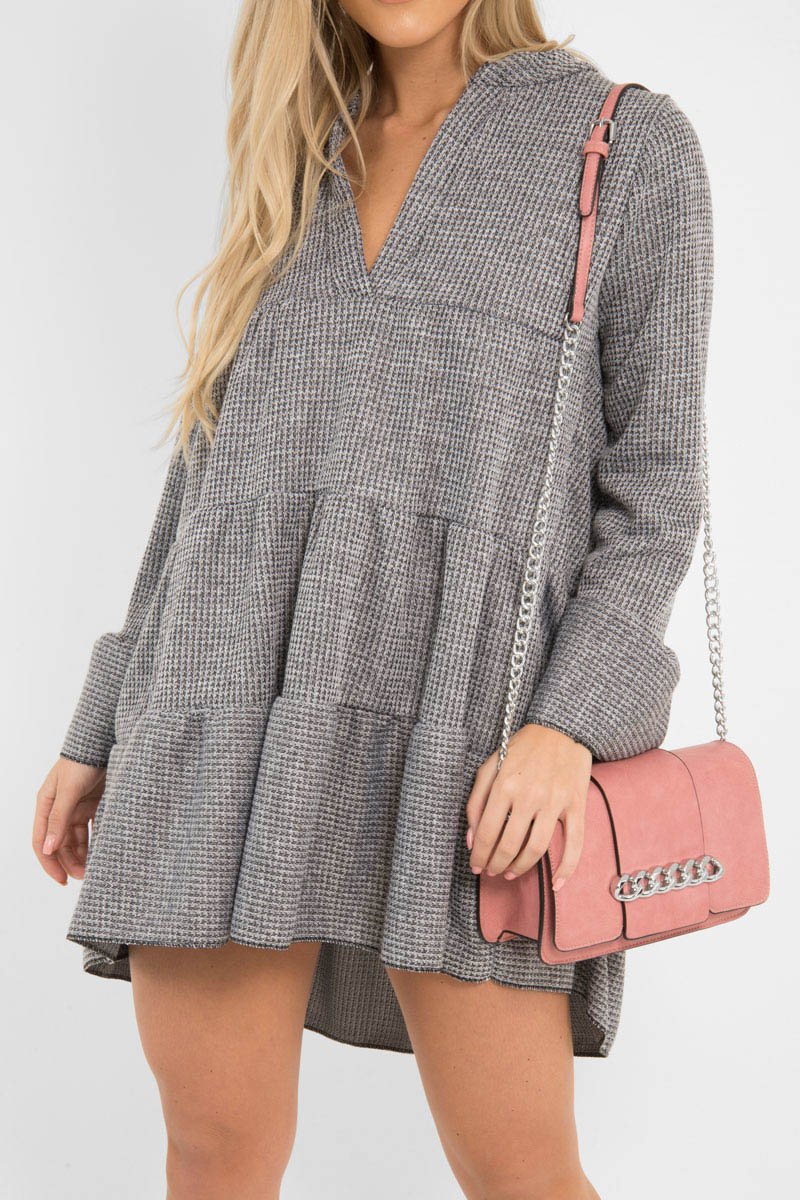 You'll be killin' knit in the Halsey Grey Knit Plunge Flute Sleeve Shift Dress, complete with plunging neckline, flute sleeve and tiered skirt. Pair with sock boots and a cute cross body bag for a totally stylish autumn/ winter look.