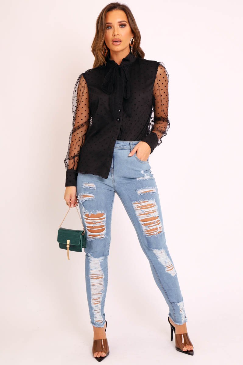 Black Mesh Polka Tie Detail Shirt - Vylette