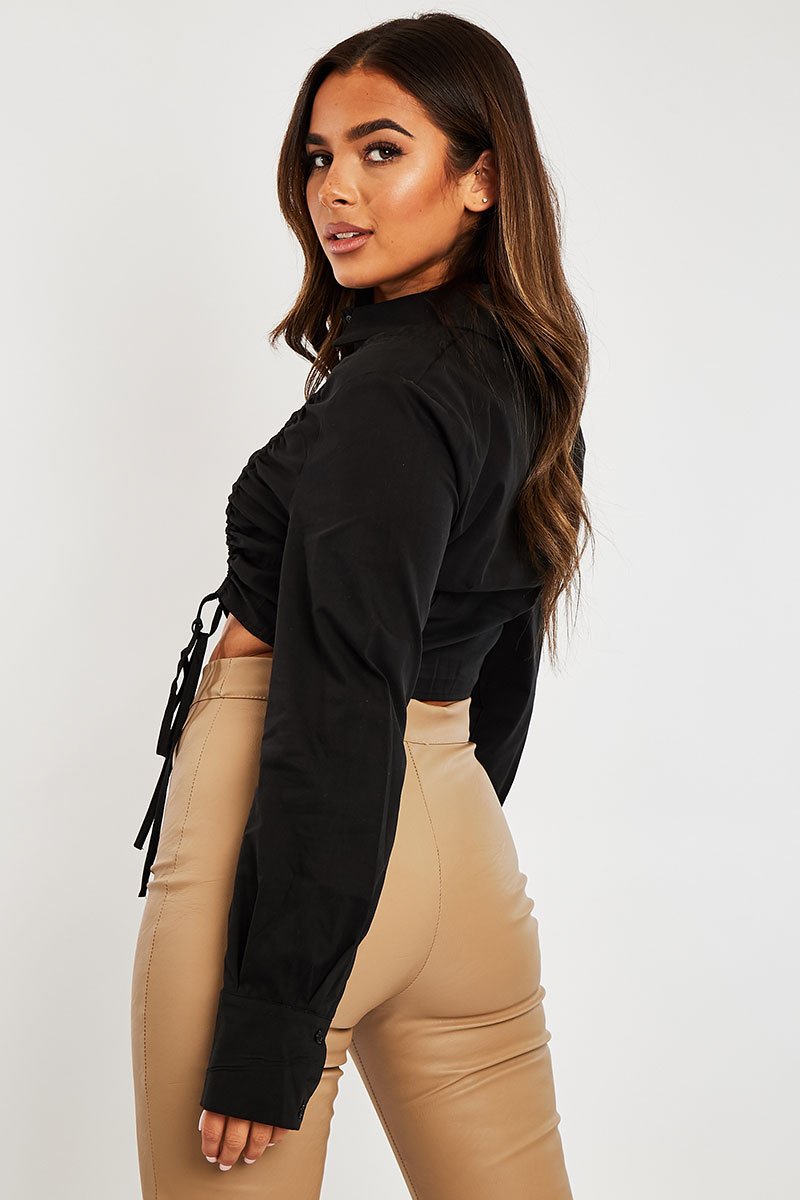 Look like a boss babe in our Brogann Black Ruched Middle Cropped Shirt. Details include lightweight fabric, ruched detail, cropped length and button front style. Pair with jeans and heels.