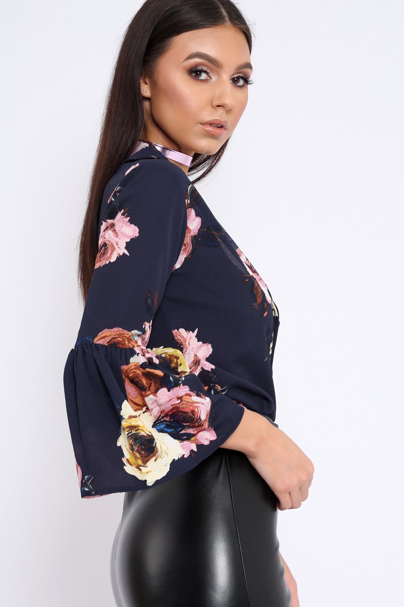 Look on point this season in the Harper Navy Floral Shirt with Bell Sleeves! Featuring collar and button down front and extreme bell sleeve.Style with high waisted PU leggings and heels!