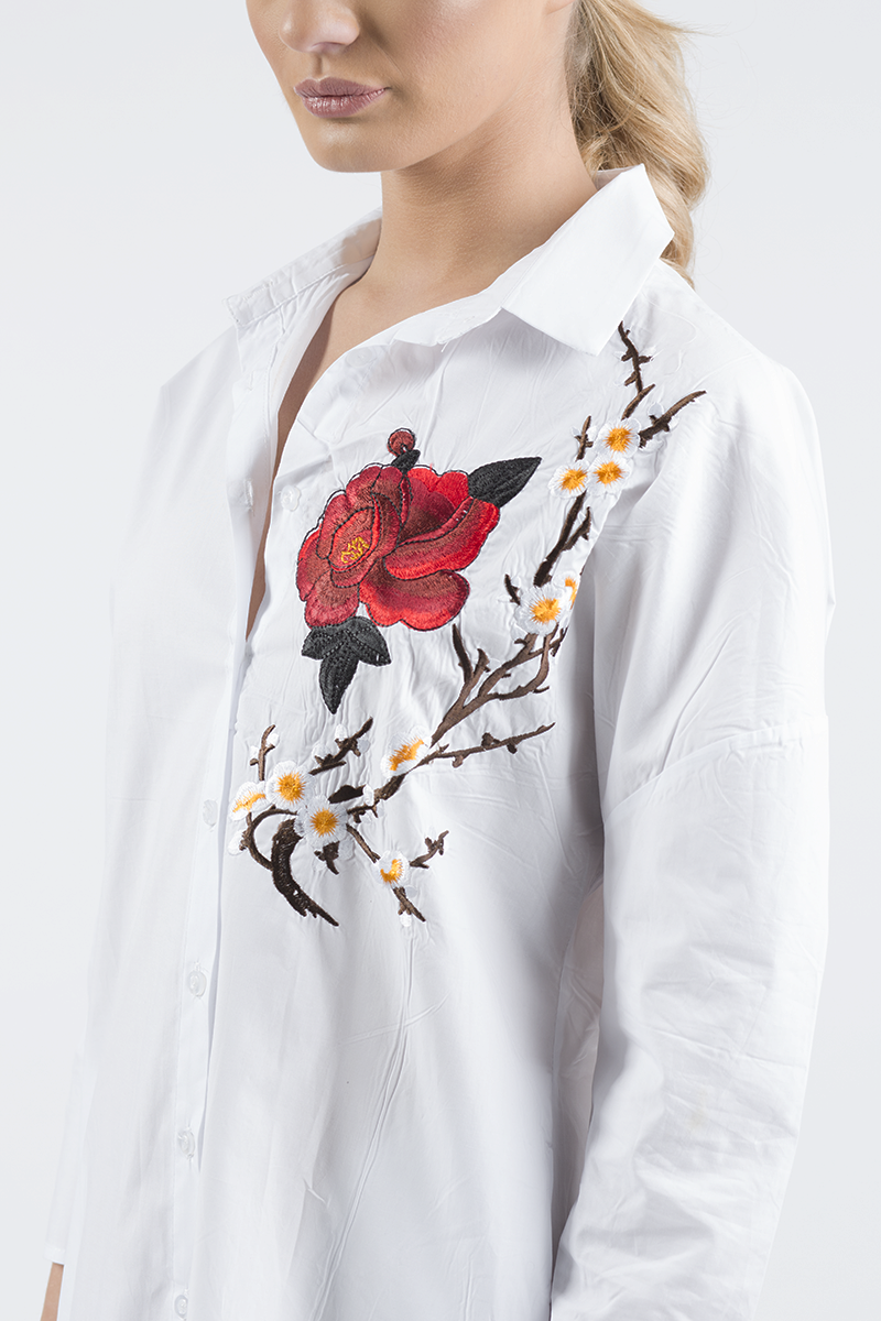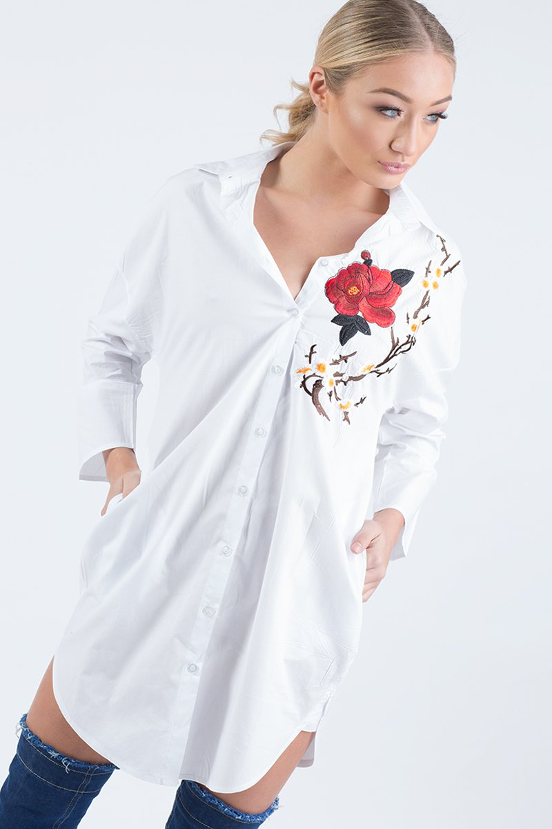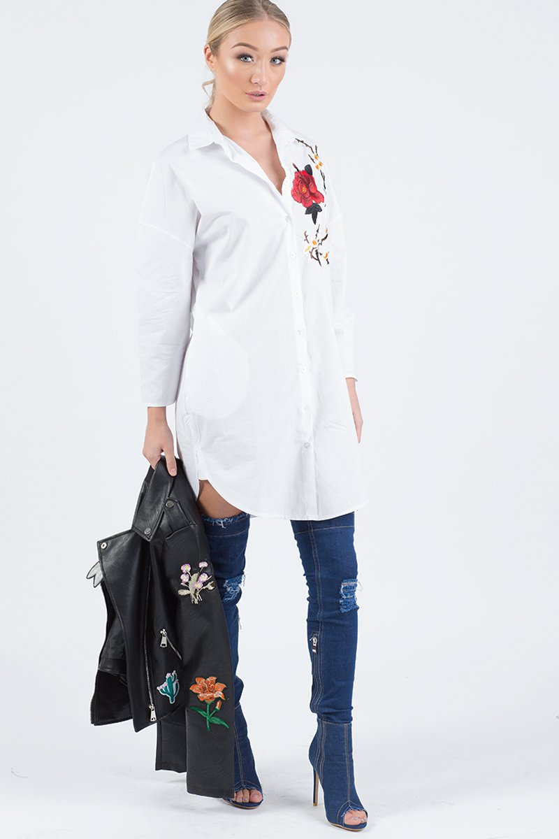 Work on trend styles in our Kate Embroidered Shirt Dress. Featuring luxe flower embroidery and longline length this shirt dress is everything right now. Style with over the knee boots or alternatively leather pants and a smart barely there heel to channel those totally luxe vibes!
