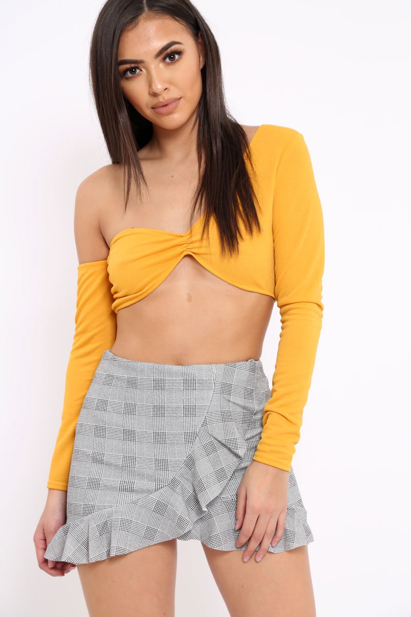 We are obsessed with our super cute Hound-Tooth Ruffle Skort. Made from mid weight non stretch fabric, this skort features a front ruffle design, a side opening zipper and a high waisted fit. Style with a crop tee for off duty vibes!