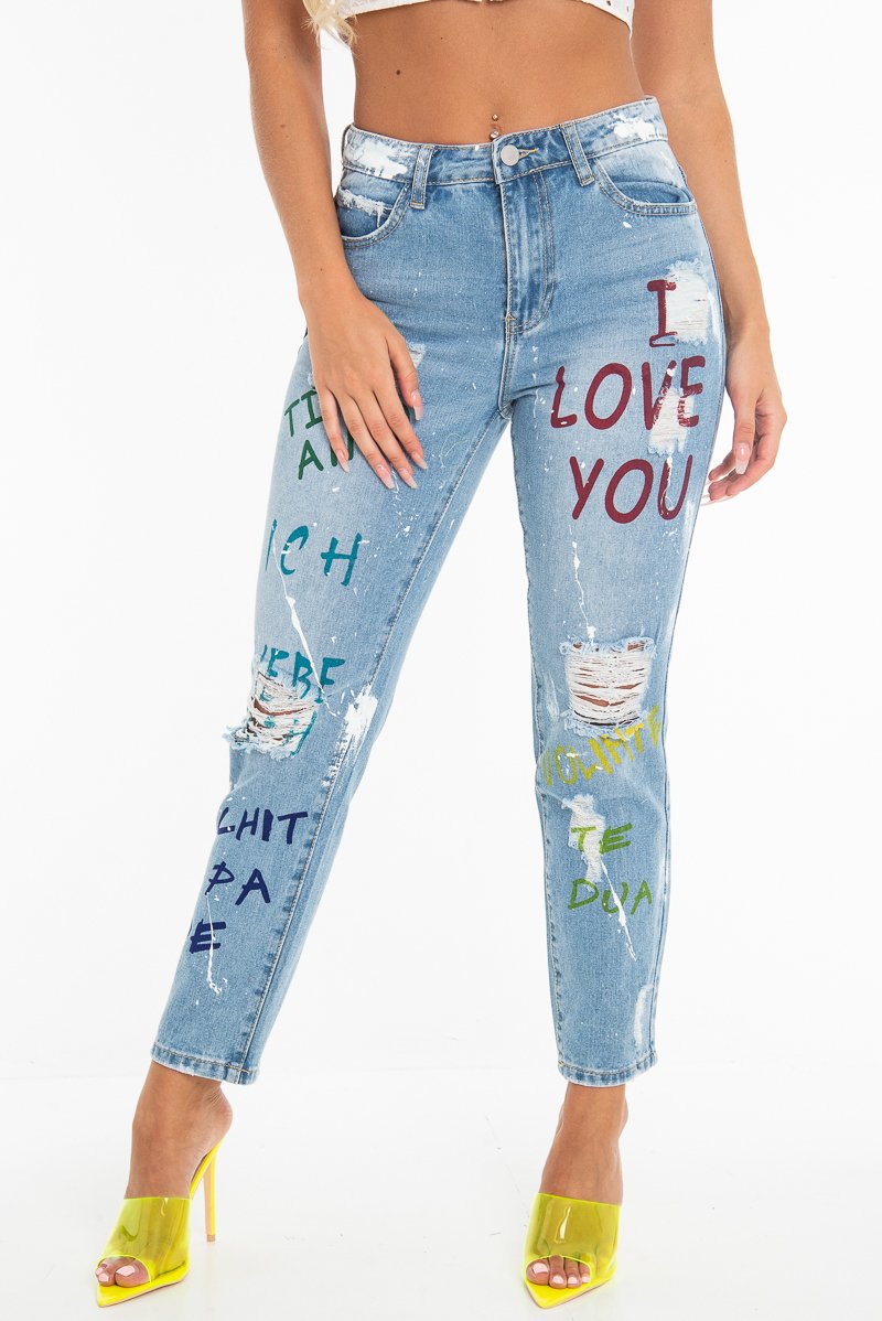 Light Wash Love Graffiti Print Distressed Boyfriend Jeans - Maggie