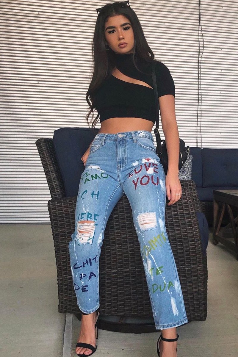 Stand out from the crowd in the Maggie Light Wash Love Graffiti Print Distressed Boyfriend Jeans, complete with high waist, distressing and slogan print. Pair with a cute tee and chunky boots for rocker chic vibes.