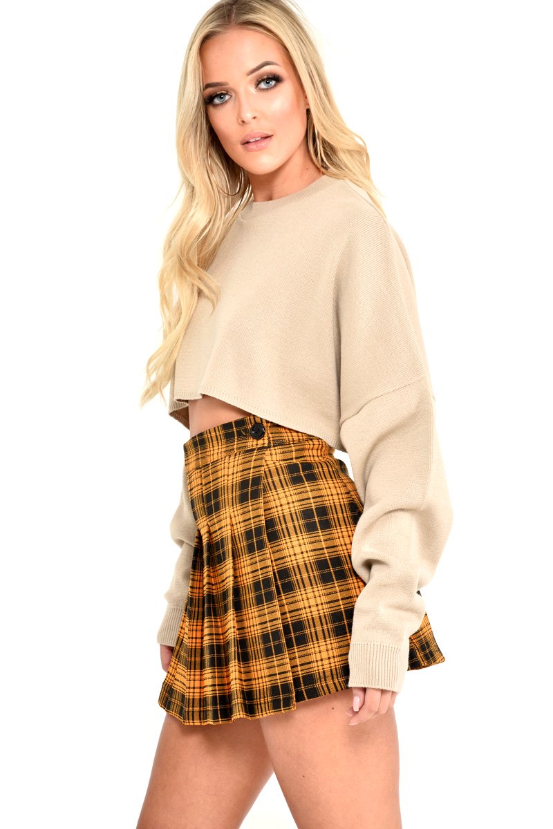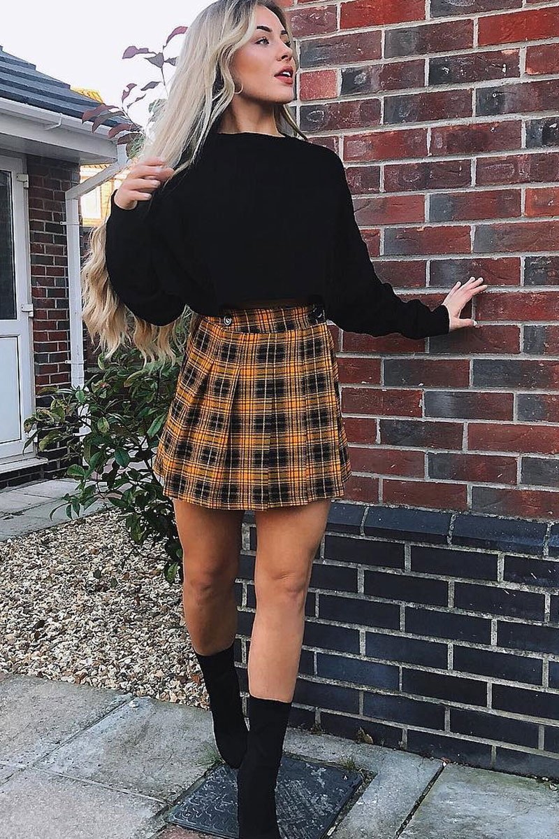 Keep your look in check in the Laela Mustard Check Button Front Pleated Skirt, complete with button front, box pleats and a-line silhouette. Pair with a cute jumper and boots for a totally 90s vibe.