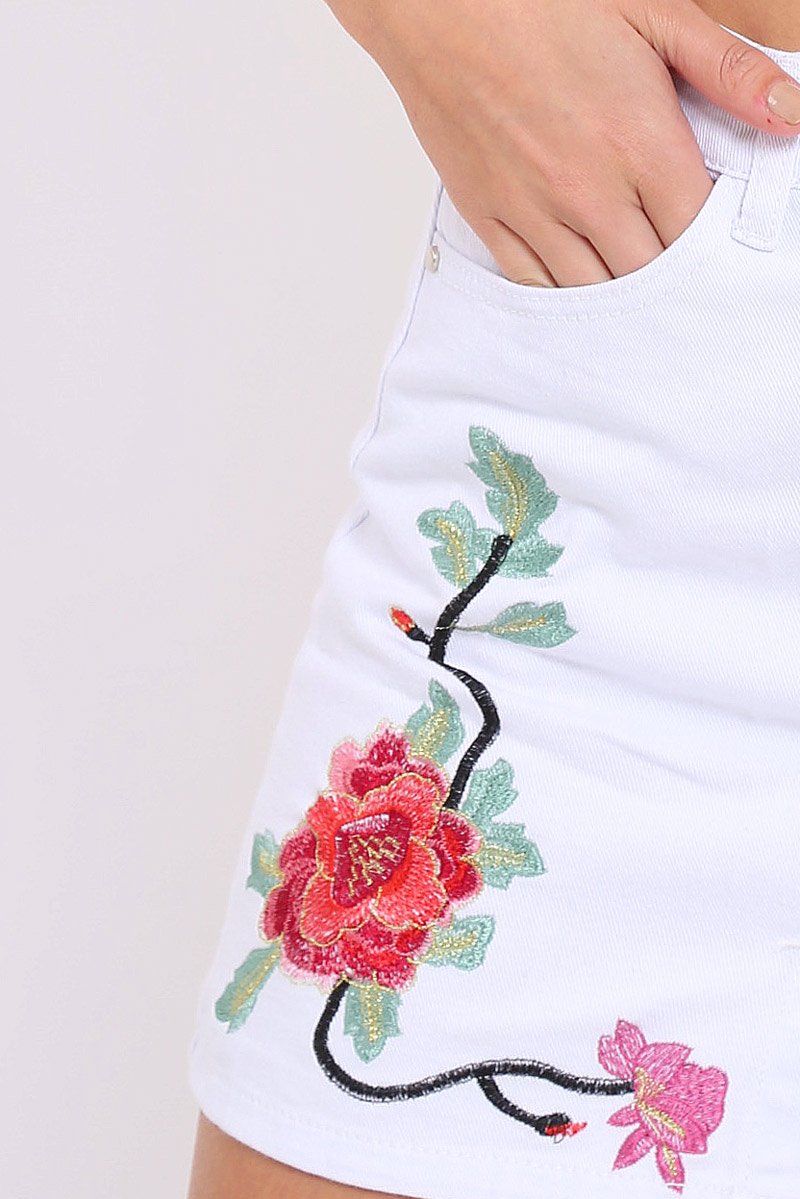 White Denim Floral Embroidered Button Front Skirt - River