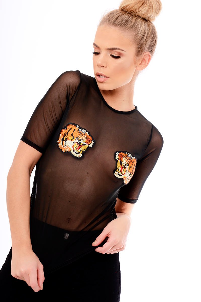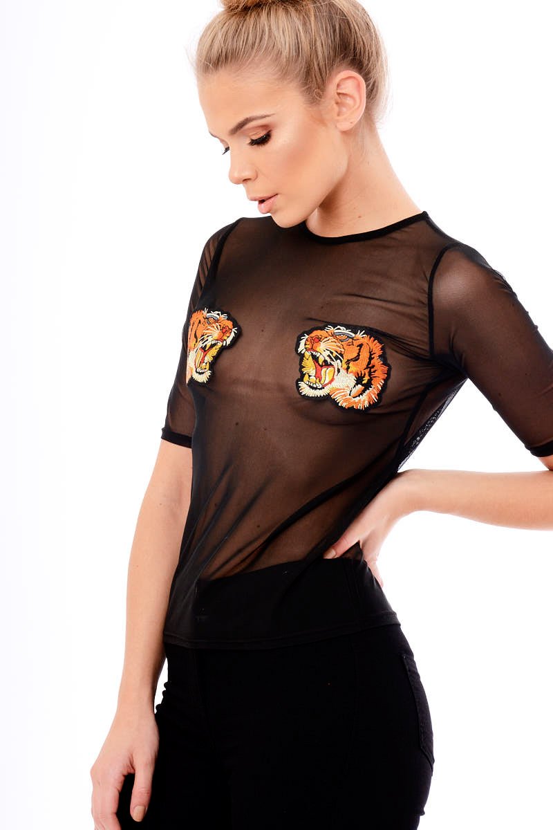 Get your new season wardrobe in check with our Kourtney Black Mesh Lion Embroidered Top. Made from a sheer mesh fabric, this top features short sleeves, a crew neckline and lion embroidered detailing. Style with your favourite pair of skinnies and an ankle boot for a slaying daytime look!