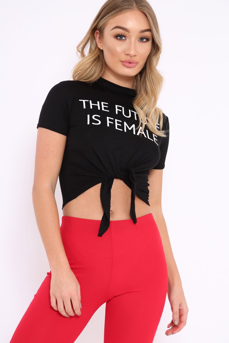 Black Slogan Tie Front Tshirt - Cicilia