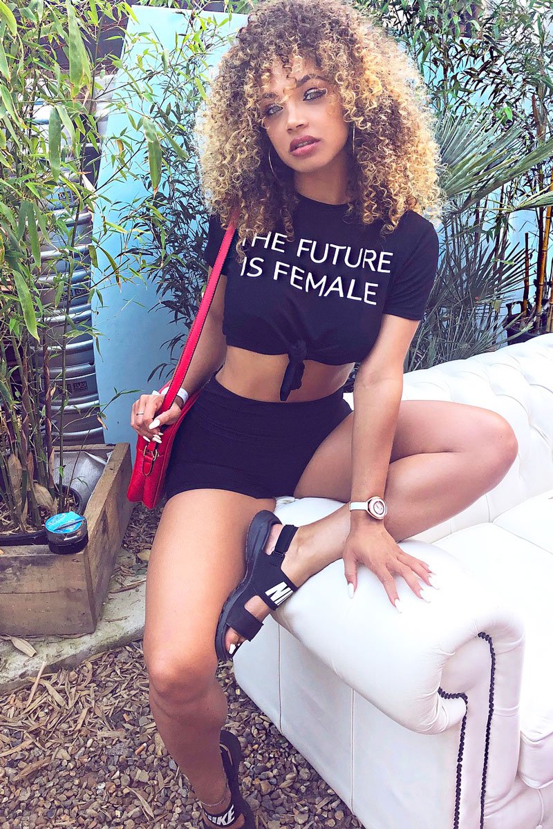 Join Our Girl Gang In The Cicilia Black Slogan Tie Front Tshirt, With White Slogan, Tie Front And Crew neck. Pair With Jean And Heels For Casual Chic!