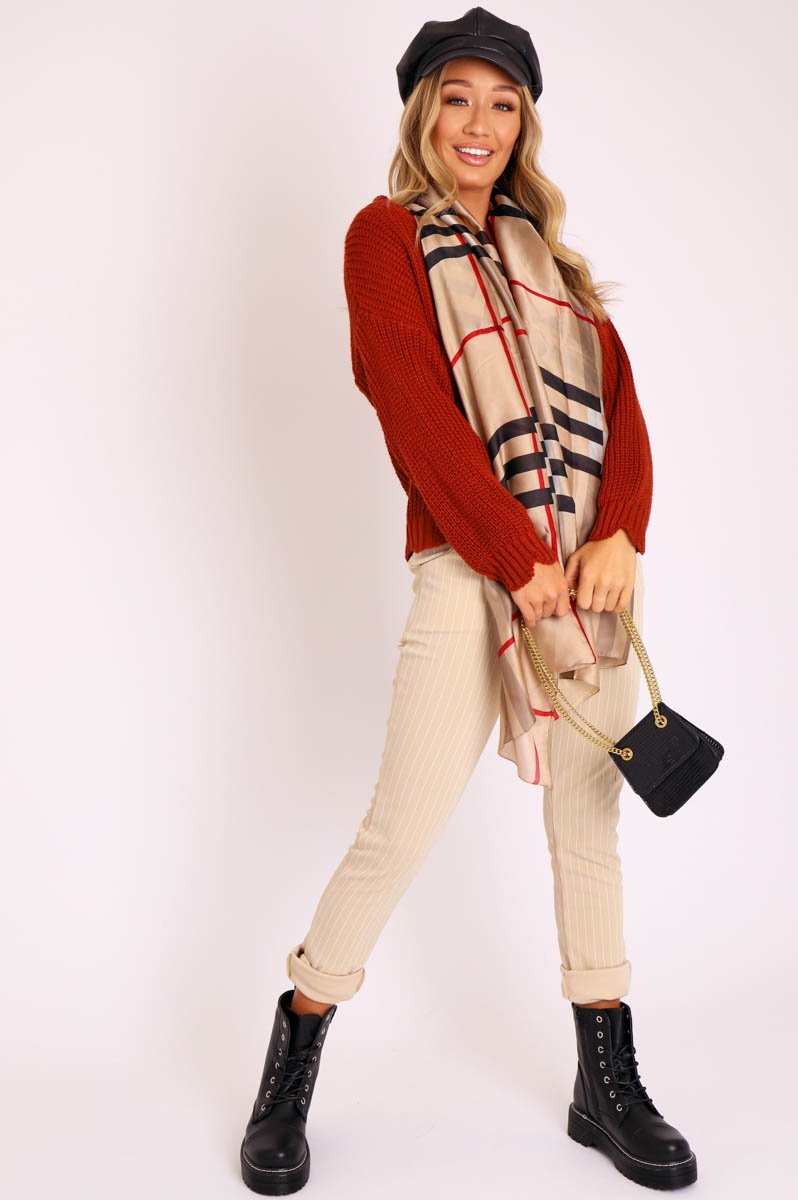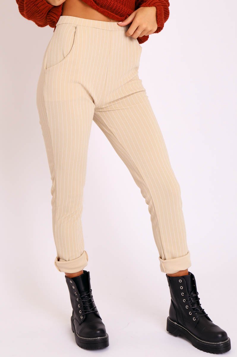 Look smart and stylish in the Priyah Nude White Stripe Tapered Pocket Detail Trousers, featuring White pin stripes and tapered fit. Style with an organza sleeve bodysuit and killa' heels for an on point look.