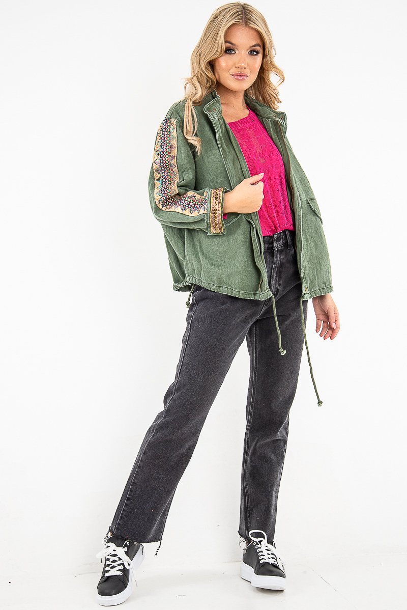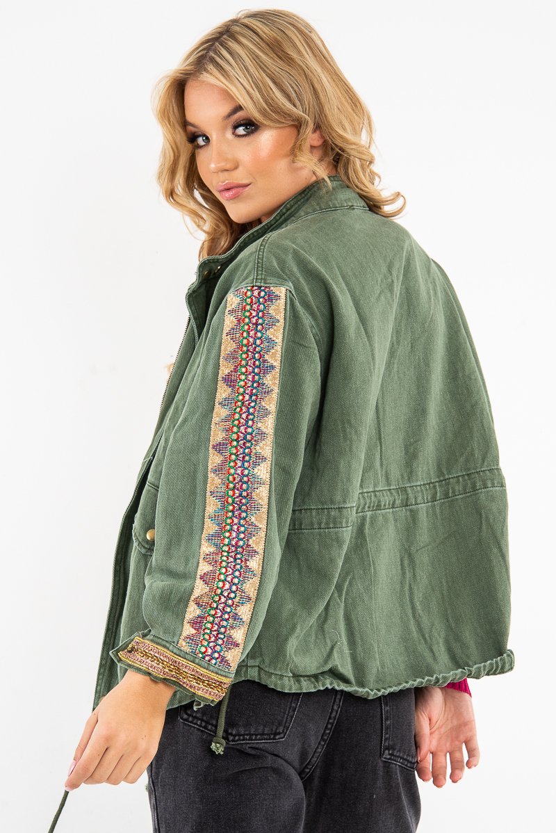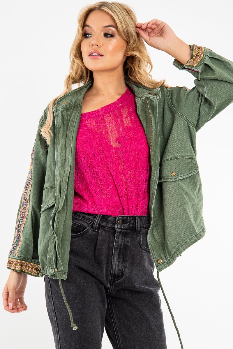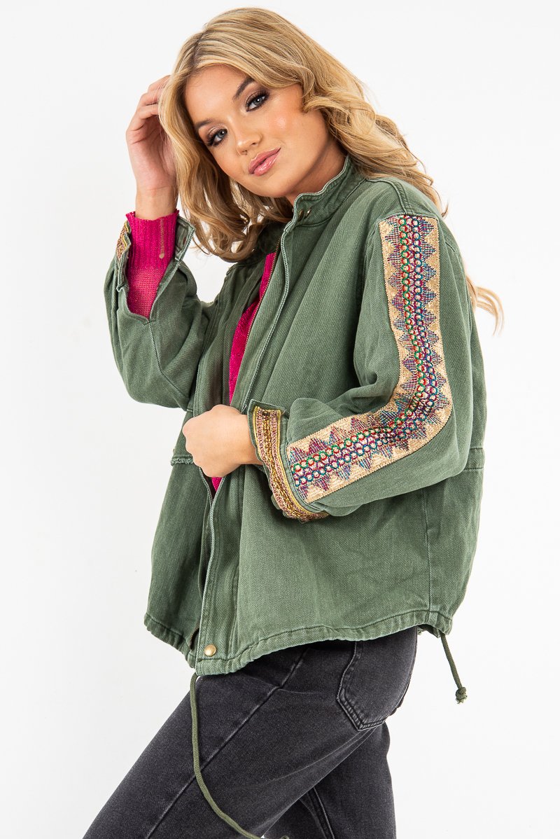 Khaki Embroidered Sleeve Detail Denim Parka Jacket - Kaori