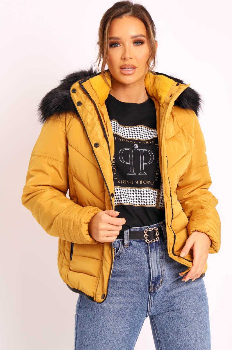 Wrap up this winter in our Lania Mustard Fur Trim Quilted Puffer Coat , featuring faux fur trimmed hood, quilted body and fur trim collar. Style with your fave jumper, skinny jeans and high knee boots.